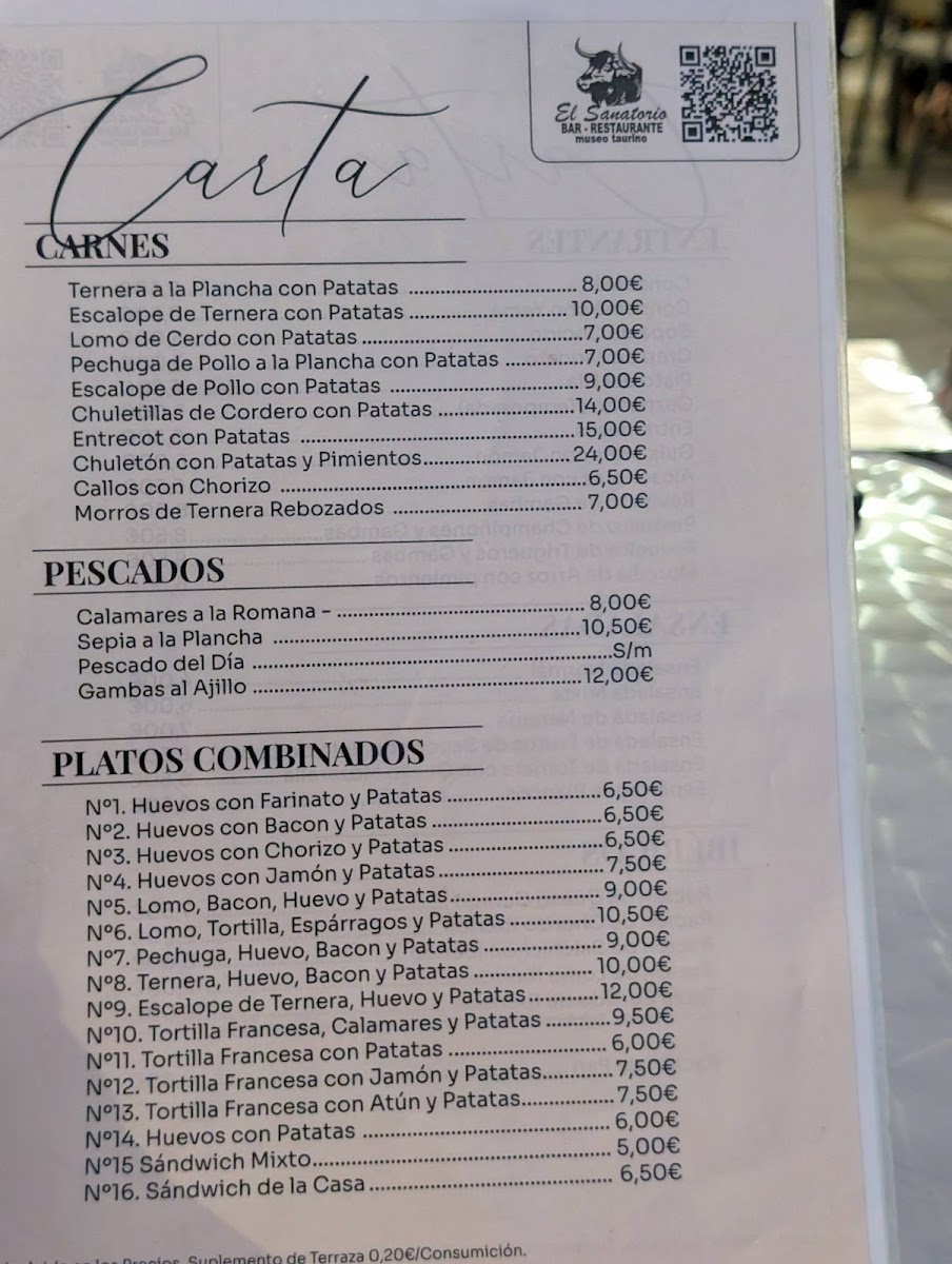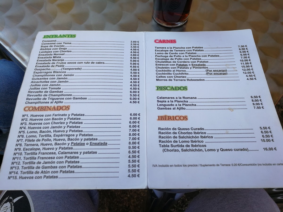 The menu structure allows for casual dining with dishes that can be ordered quickly or enjoyed as part of a more leisurely meal. It offers a combination of light bites and more substantial plates suitable for different appetites throughout the day. Drinks and bar items complement the food choices, catering to those looking for traditional Spanish bar fare.