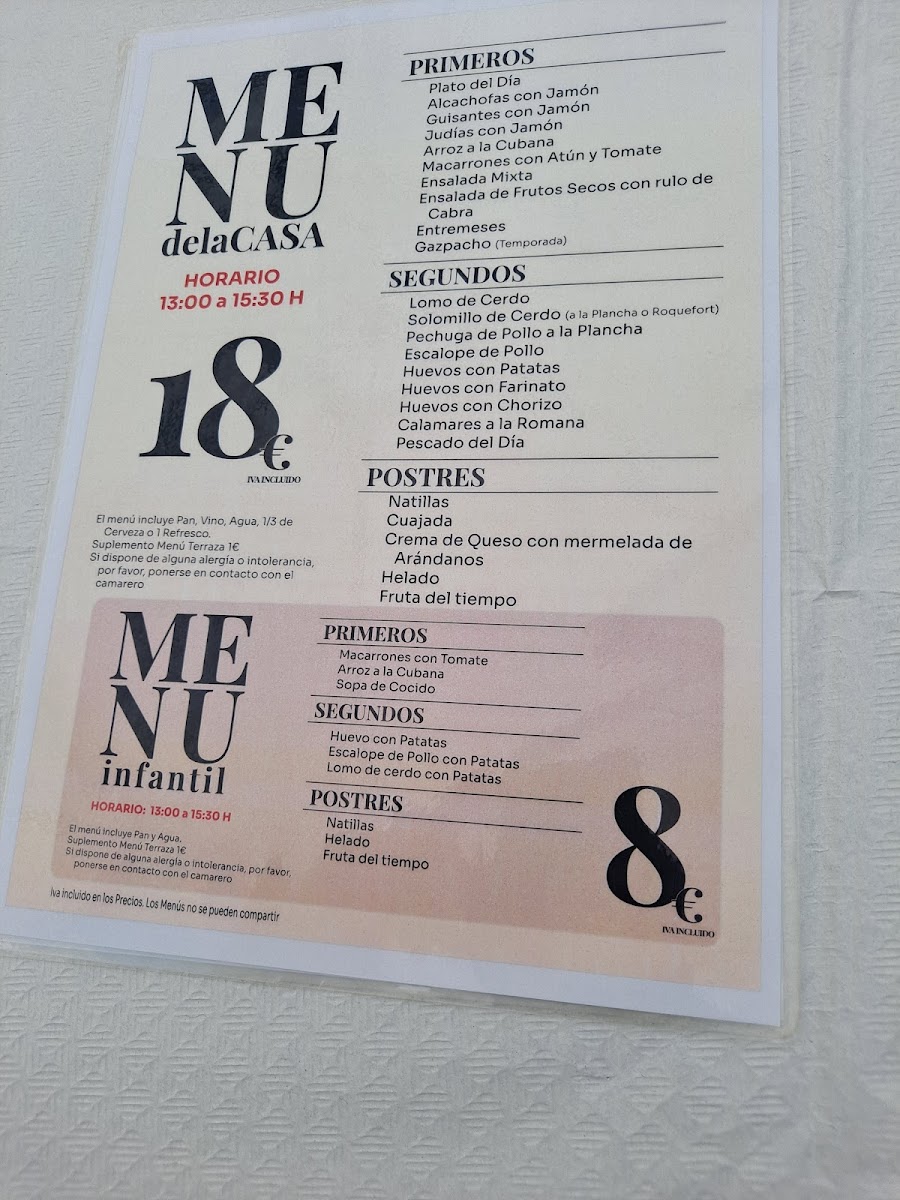 - Main Dishes: Traditional hearty items like garbanzos verduras y carnes del cocido (chickpeas with vegetables and meat stew), alubias con oreja (beans with pig’s ear), arroz con leche (rice pudding), and macarrones con atún (macaroni with tuna).